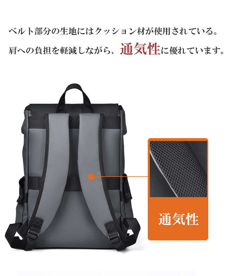 【人間工学に基づいた減圧設計のビジネスリュック】ビジネスリュックの重量はわずか0.685kg。多くの荷物を持ち運ぶ場面でも、バッグ自体の重さによる負担を感じることはありません。背面部分には厚手のメッシュエアクッションが採用されて、肩紐部分は幅広の設計になっていて、最適な幅と厚みにより、圧力と重さを効果的に分散し、肌に優しく通気性のよいメッシュ生地は暑い夏でも汗をかかず、背中を軽く保つことができます。