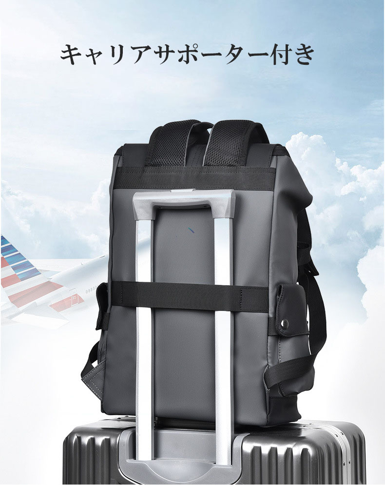 スーツケースに乗せて持ち手に固定ができるよう背面には薄型のベルトが付いています。出張や旅行に意外と便利な嬉しいひと工夫。バックパックを固定できて手と背中が空くため、荷物がごちゃついて動きづらいなどの移動中のストレスが大幅に減少します。