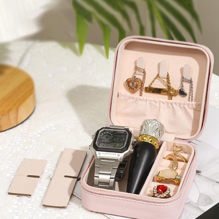 【シンプルなデザイン】ケース蓋の背面にネックレスやブレスレットを保管でき、下の袋はペンダントを保護可能です。左のパーティション取り外しが可能で、リップスティックと腕時計も気楽に収納できます。ファスナーの設計でジュエリーが落としにくいです。