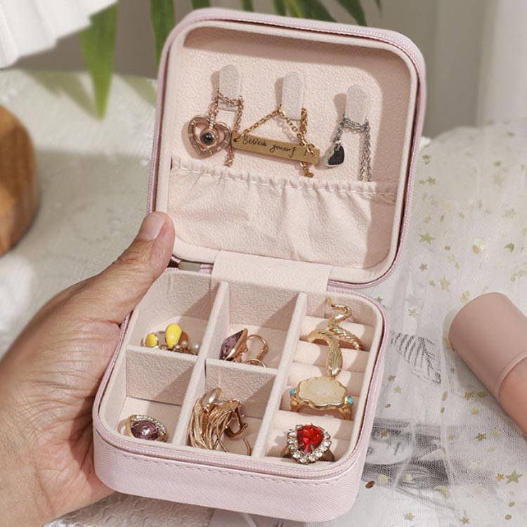 【コンパクトジュエリーケース】サイズは10*10*5cm、置き場を取らない宝石箱です。お手頃なサイズで持ち運びやすいです。手元に持って多数のアクセサリーを楽に収納でき、旅行、外出、出張や飲み会などの場面で携帯するのも便利ですし、カバンに置くのも楽です。