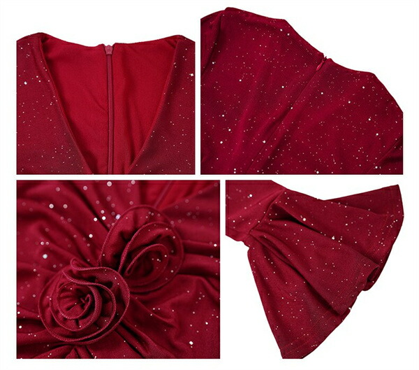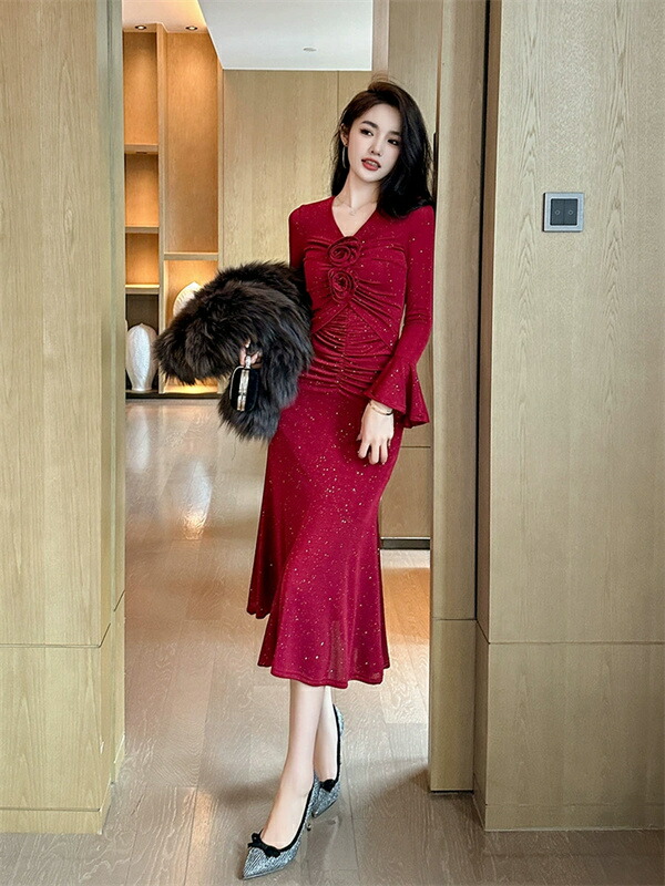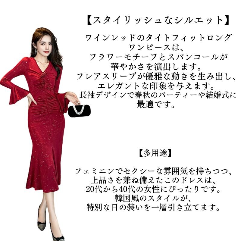 フラワーモチーフとスパンコールが特徴のワインレッドのタイトフィットロングワンピースパーティードレスエレガント フェミニンレディース韓国 ファッションam5552
