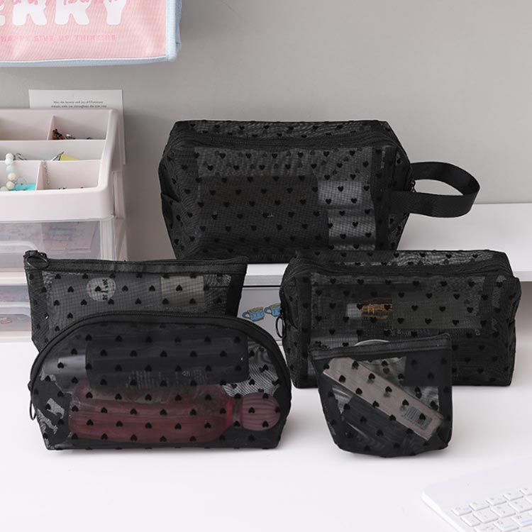メイクポーチ ポーチ トラベルポーチ ハート クリアポーチ メッシュポーチ 5点セット レディース コスメポーチ ハート柄 軽量 メッシュ クリア 透明感 コンパクト 化粧ポーチ 出張 収納便 大容量