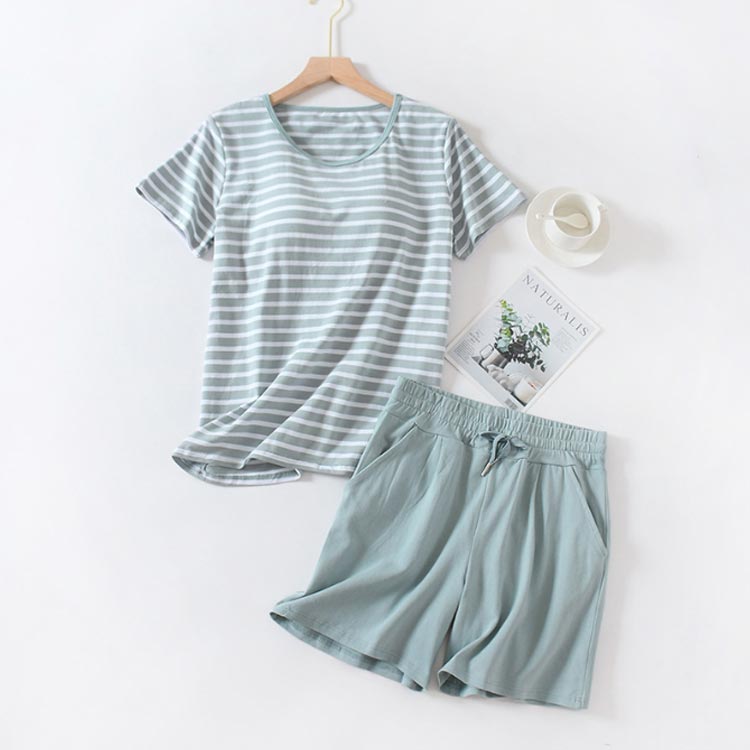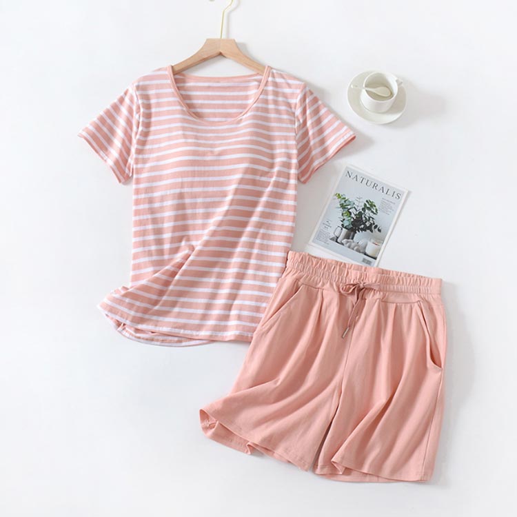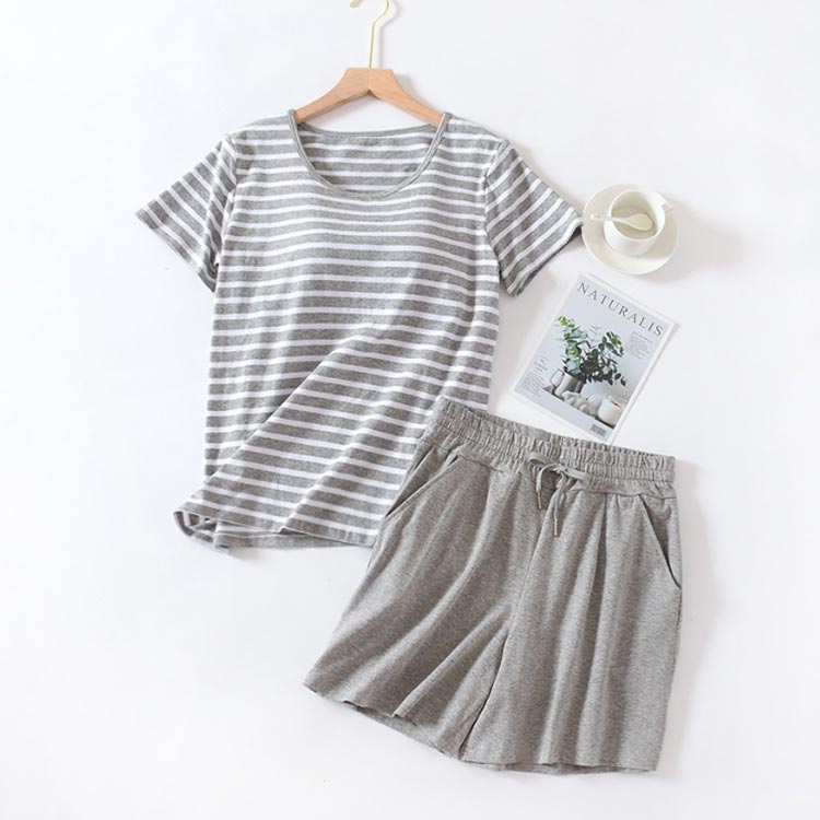 締め付けない 夏 コットン 綿 ルームウェア 半袖 ボーダー カップ付き レディース ブラ付き 半袖Tシャツ ショートパンツ 上下セット パジャマ セットアップ カップ付きTシャツ 2点セット 部屋着