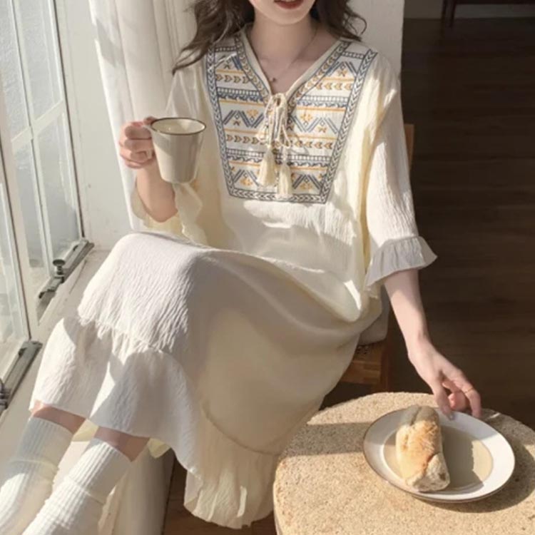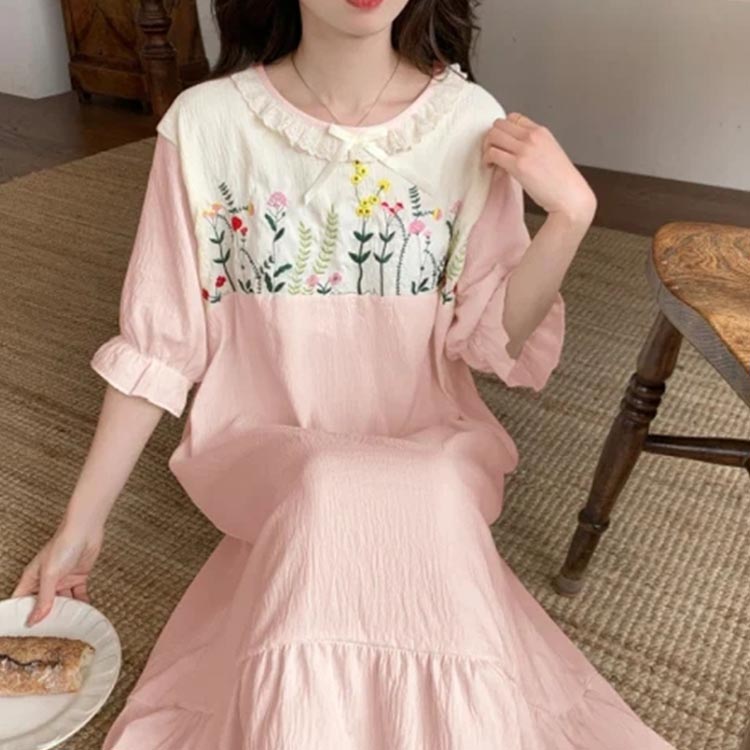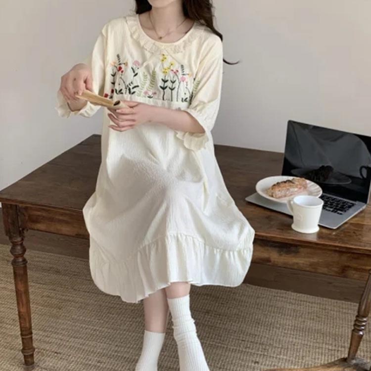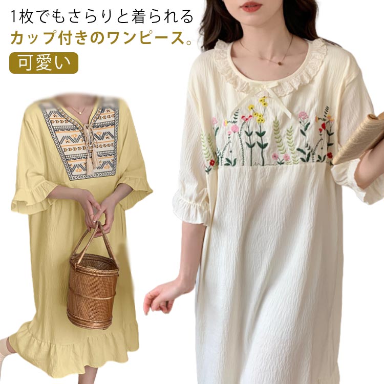 ルームウェア 5分袖 可愛い 刺繍 ワンピース 部屋着 半袖 大きいサイズ ロング レディース ルームワンピース パジャマ 綿 ナイトウェア 夏 フリル コットン 寝間着 リラックス ワンマイ 涼しい