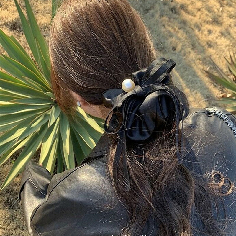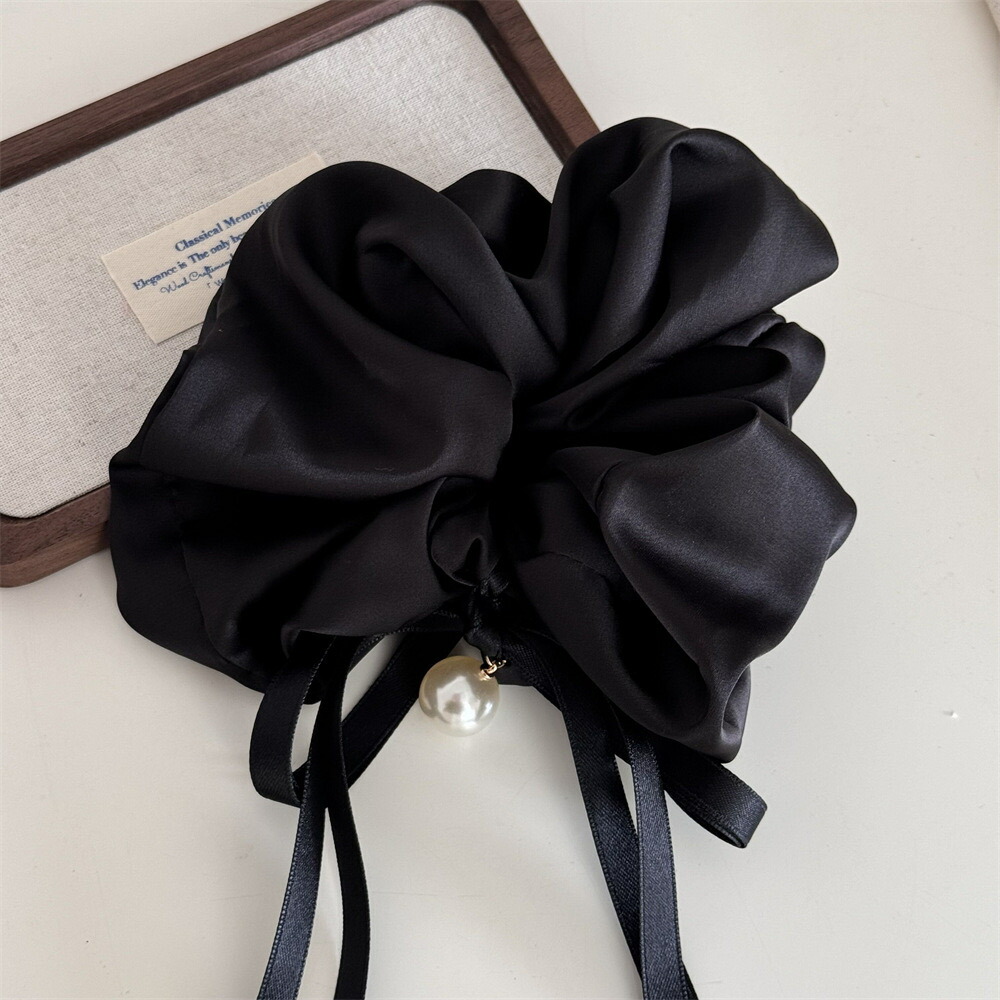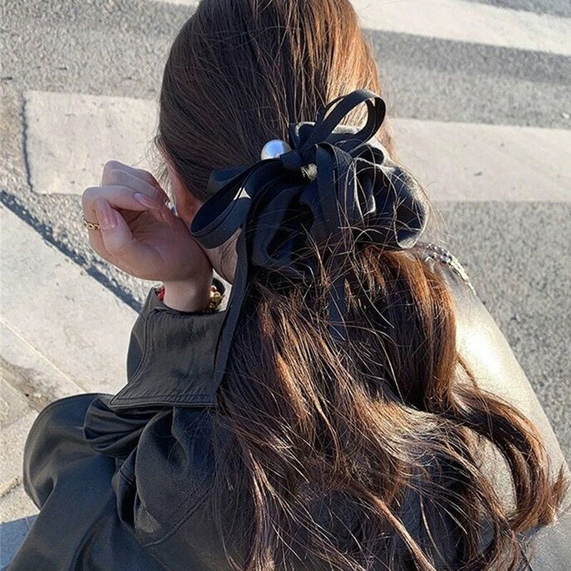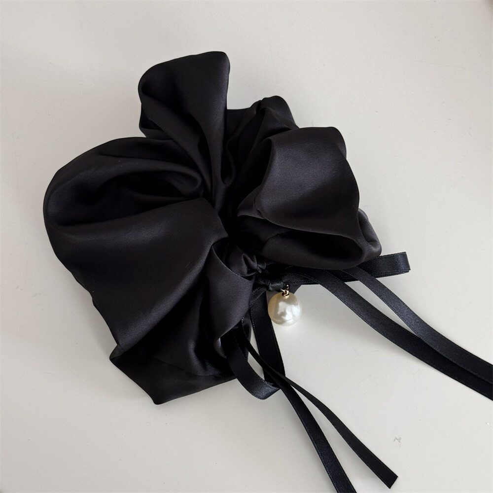 ビッグシュシュ パールシュシュ ヘアゴム ロングリボン ボリューム サテン おしゃれ 大人可愛い レディースヘアアクセサリー ブラック