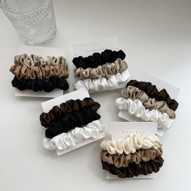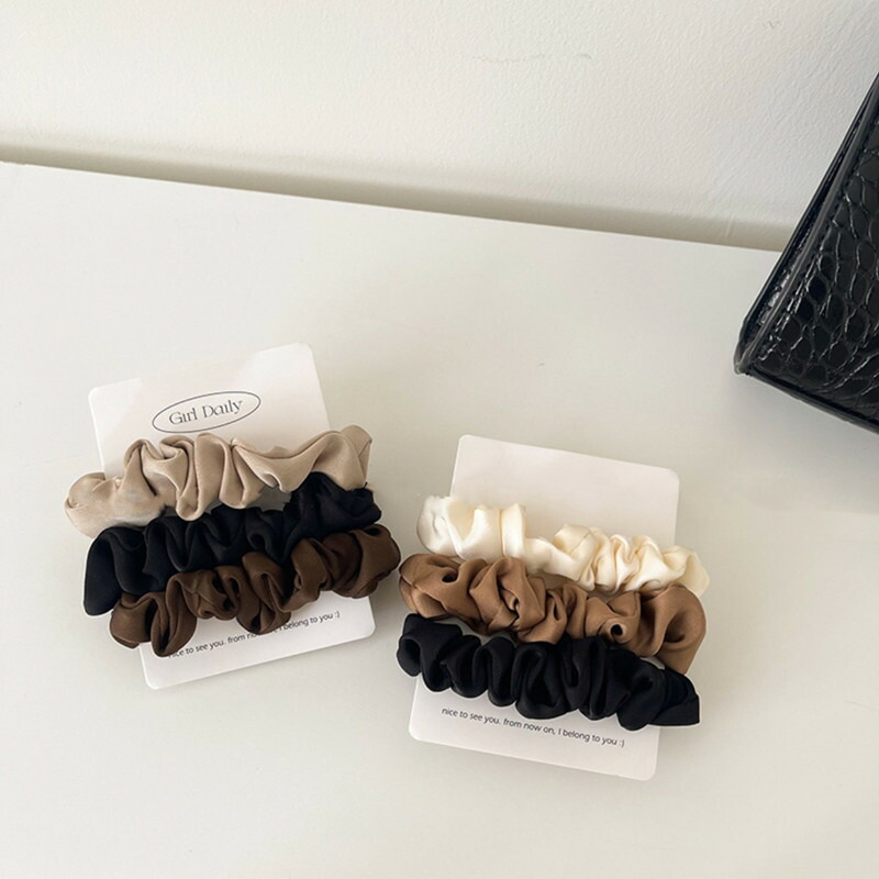 サテンシュシュ3個セット スリムカラーシュシュ レディースヘアアクセサリー ヘアゴム 3色セット シンプル 無地 おしゃれ 大人可愛い
