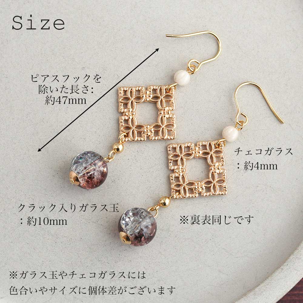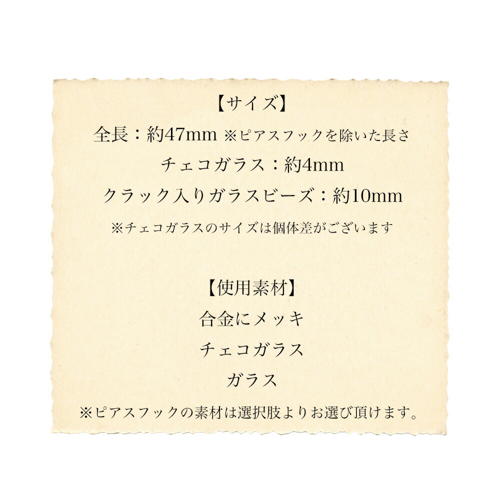 ◆サイズ:全長 約47mm(ピアスフック部分を除いた長さ)チェコガラス:約4mm、クラック入りガラスビーズ:約10mm