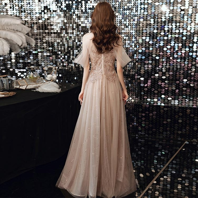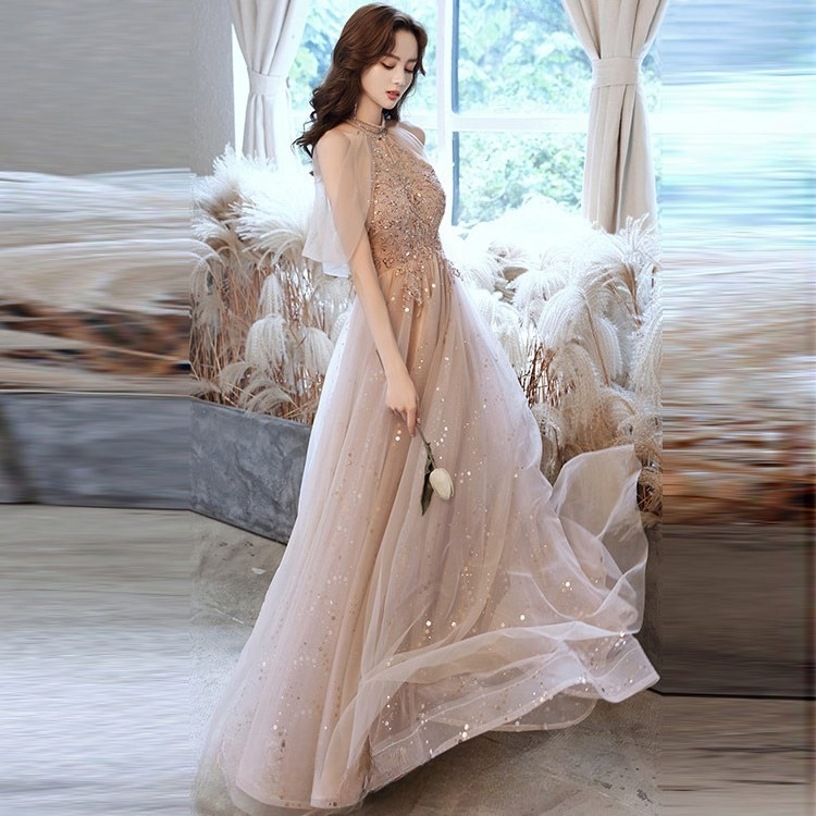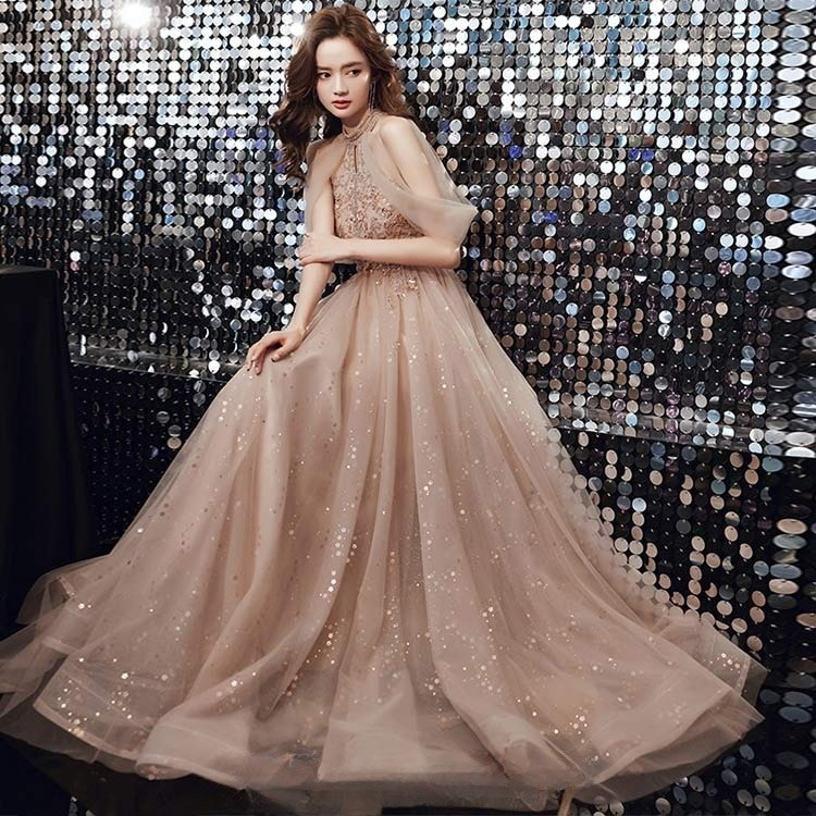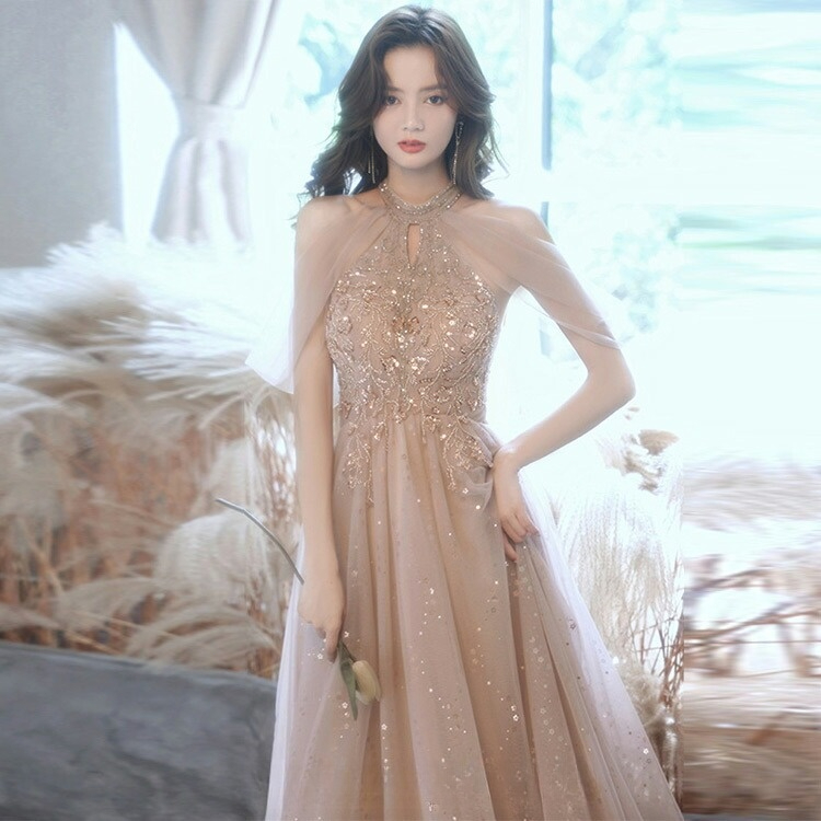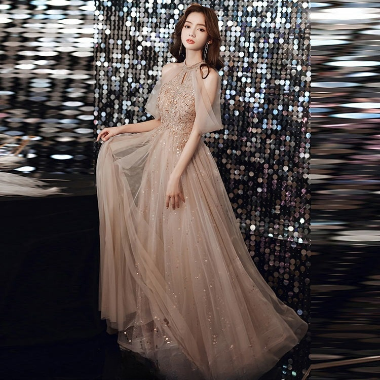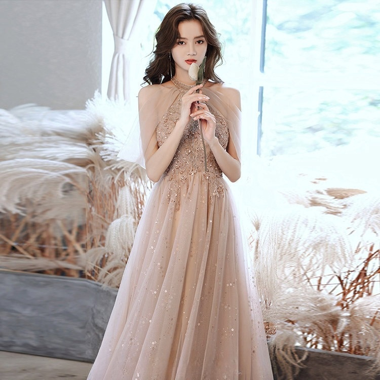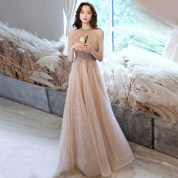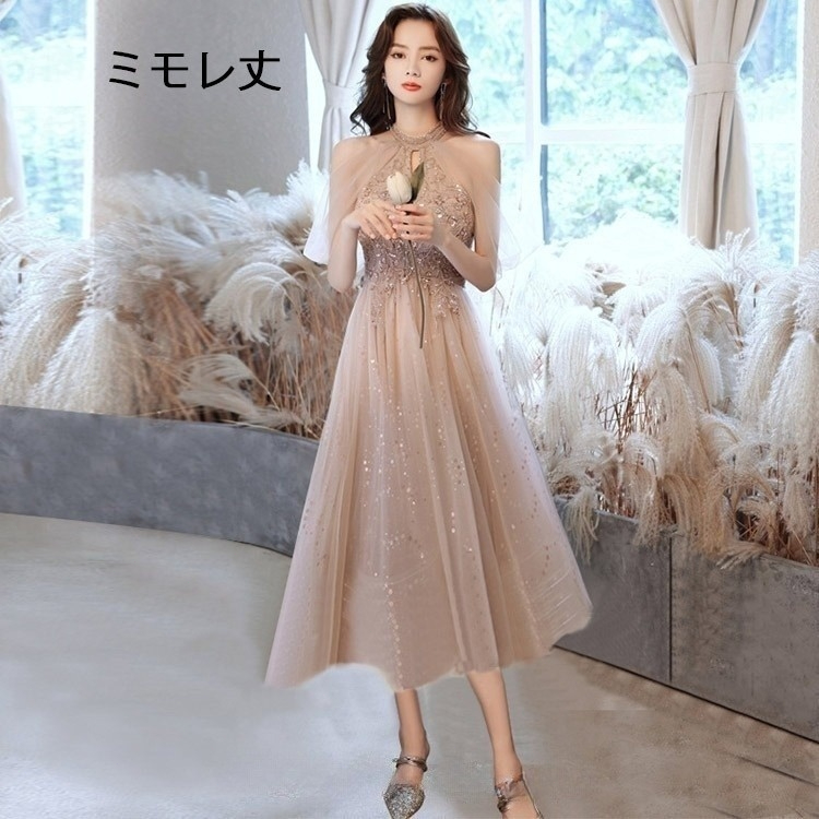 イブニングドレス ホルターネック オフショルダー パーティードレス ロングドレス シャンパンピンク スパンコール キラキラドレス 発表会ドレス 演奏会ドレス20代 30代 40代 キレイめ
