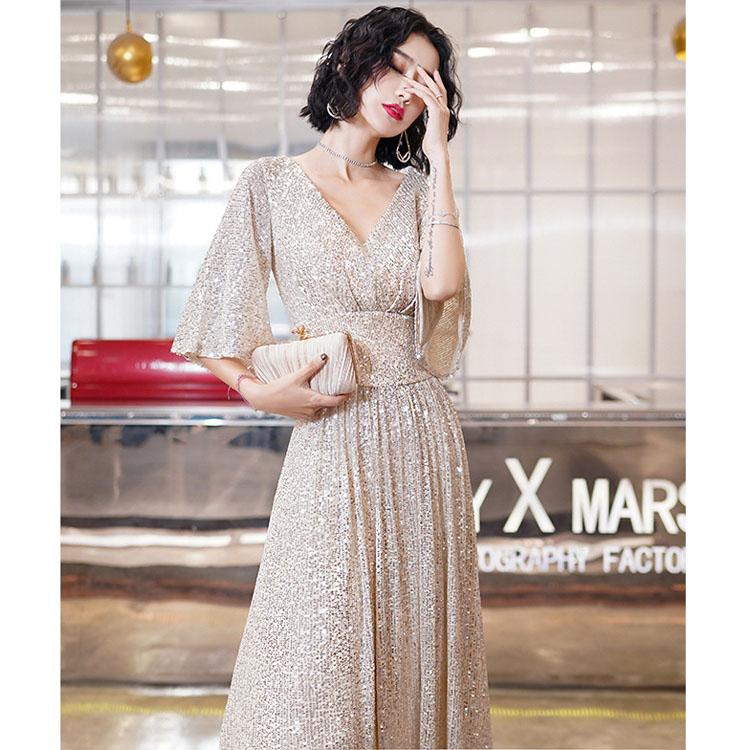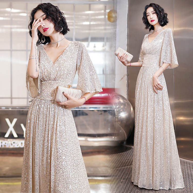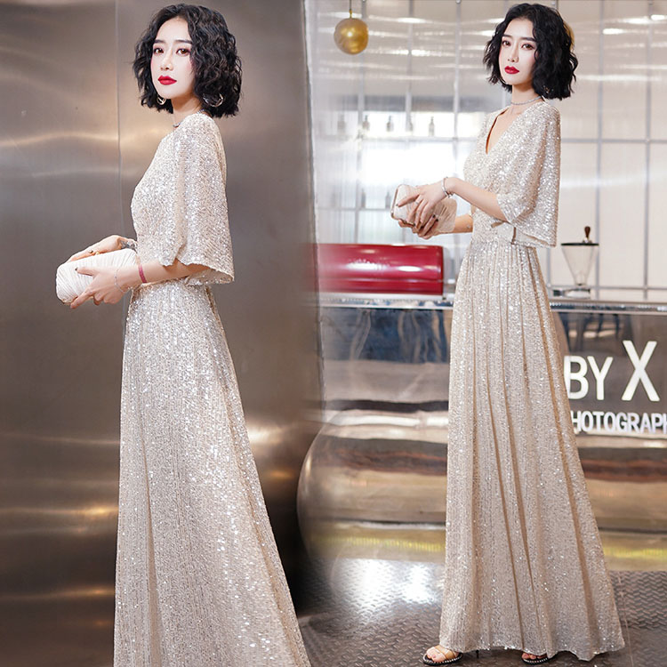 送料無料 イブニングドレス スパンコール キラキラドレス シルバー 発表会ドレス ロングドレス Vネック 着瘦せ パーティードレス 銀色 5分袖 結婚式ドレス 二次会ドレス 大きいサイズ Aライン ロング S M L XL XXL XXXL