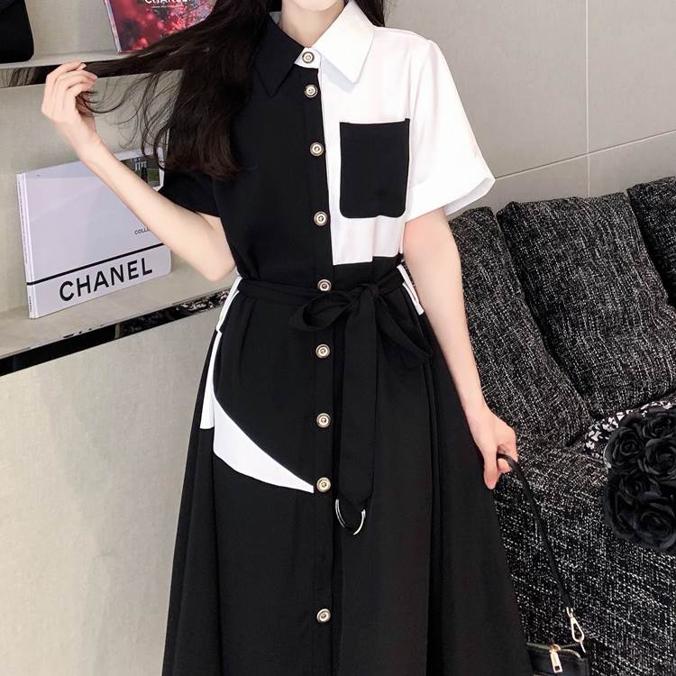 ワンピース レディース シャツワンピース ミディアム丈 ロング丈 袖あり 半袖 フレア Aライン 切り替えデザイン アシンメトリー ドッキング ウエストマーク ウエストベルト ウエストリボン きれいめ 上品 おしゃれ お洒落 かっこいい 個性的 主役級 存在感 M L XL 2XL 3XL 4XL 大きいサイズ ブラック ホワイト 黒 白 モノトーン バイカラー 夏 10代 20代 30代 40代 デート お出かけ 休日 パーティー イベント