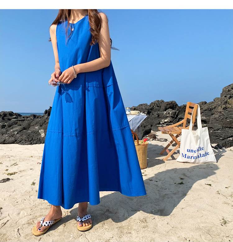 ティアード レディース ロング ワンピース ノースリーブ マキシ ラウンドネック フレア Aライン ロイヤルブルー 青 綿 かわいい 大人 きれいめ シンプル カジュアル おしゃれ こなれ感