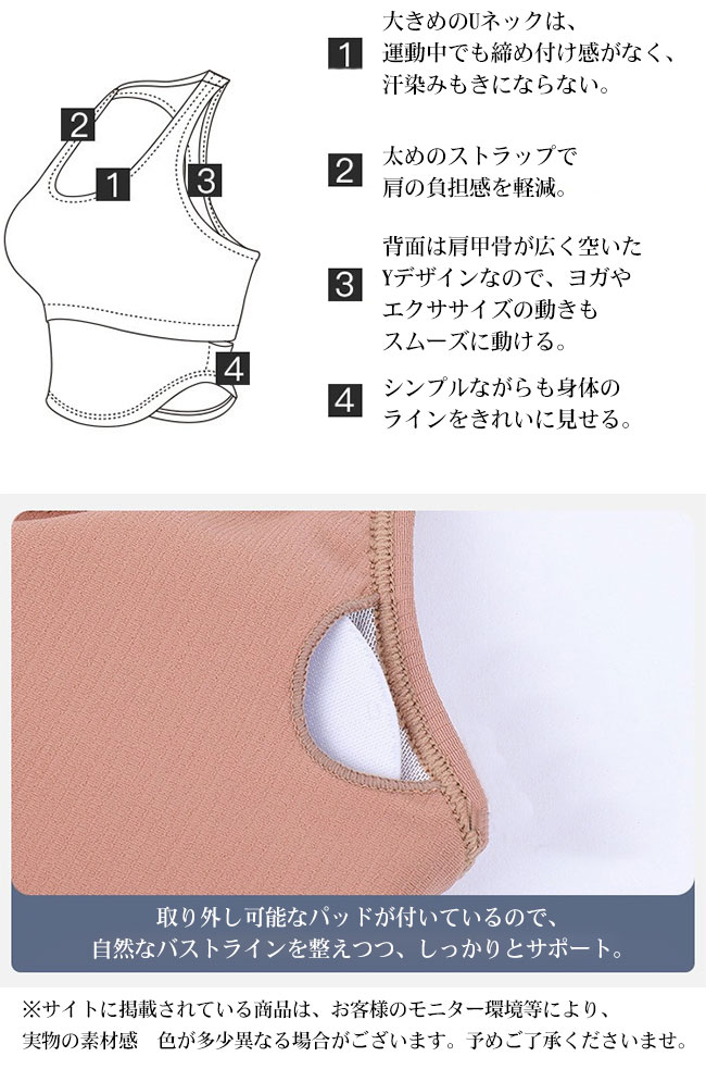 ●背面は肩甲骨が広く空いたYデザインなので、ヨガやエクササイズの動きもスムーズに動ける。