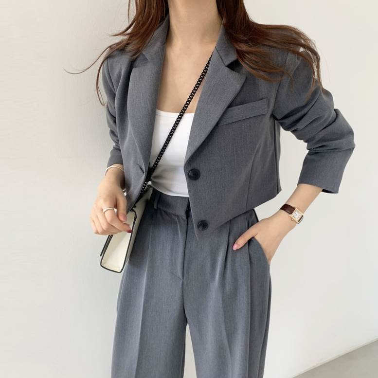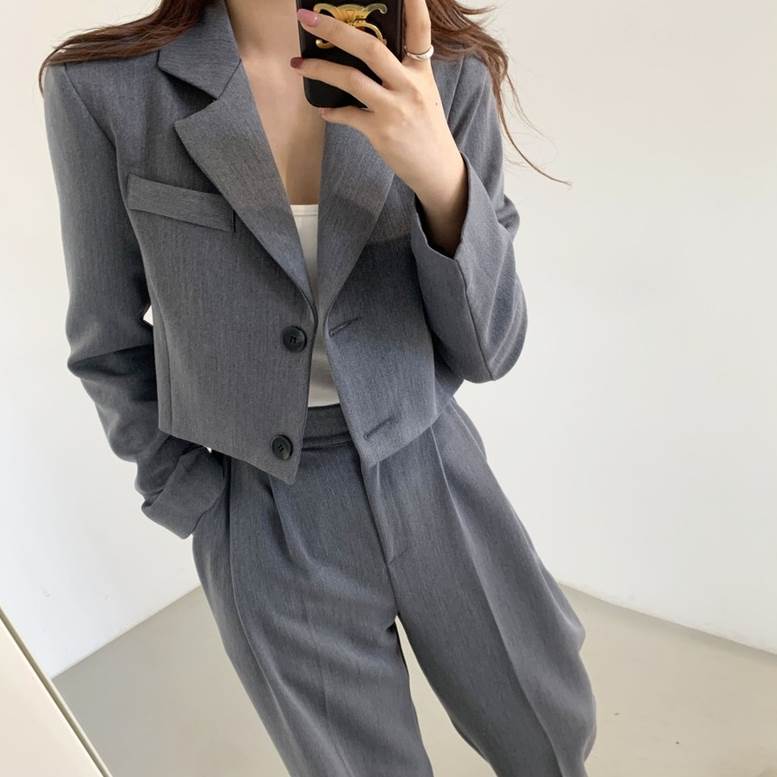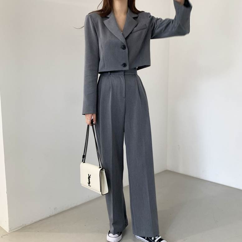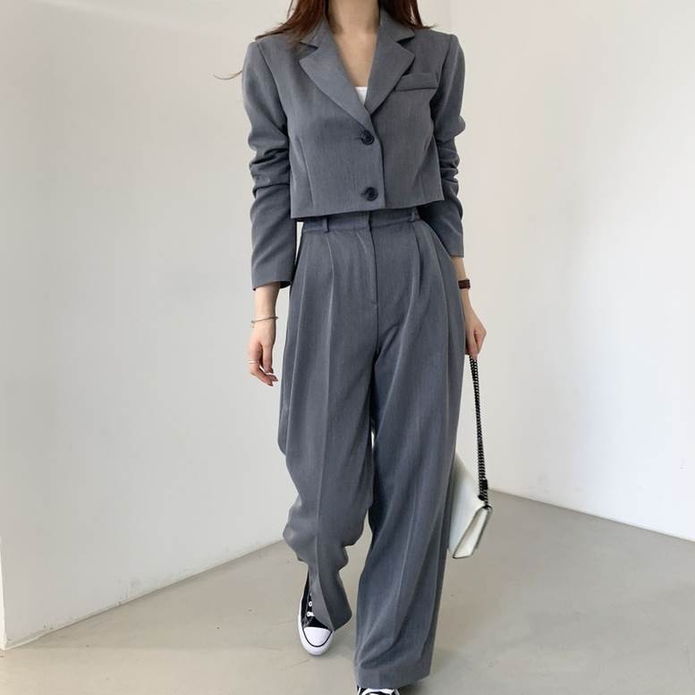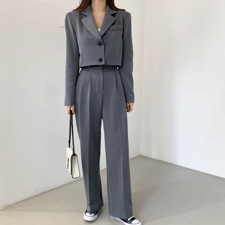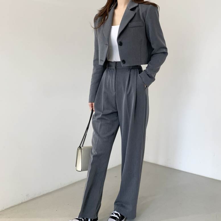 クロップドジャケット&センタープレスパンツスーツ セットアップ レディース 春 秋 上下 ツーピース スーツ 個性的 パンツスーツ クロップド丈 ロングパンツ