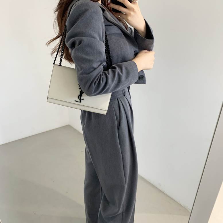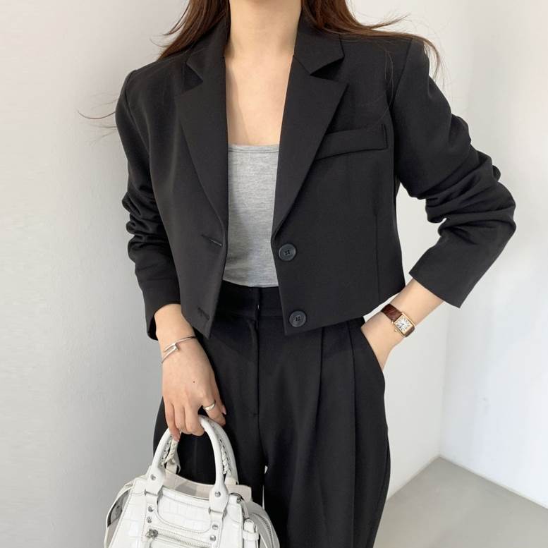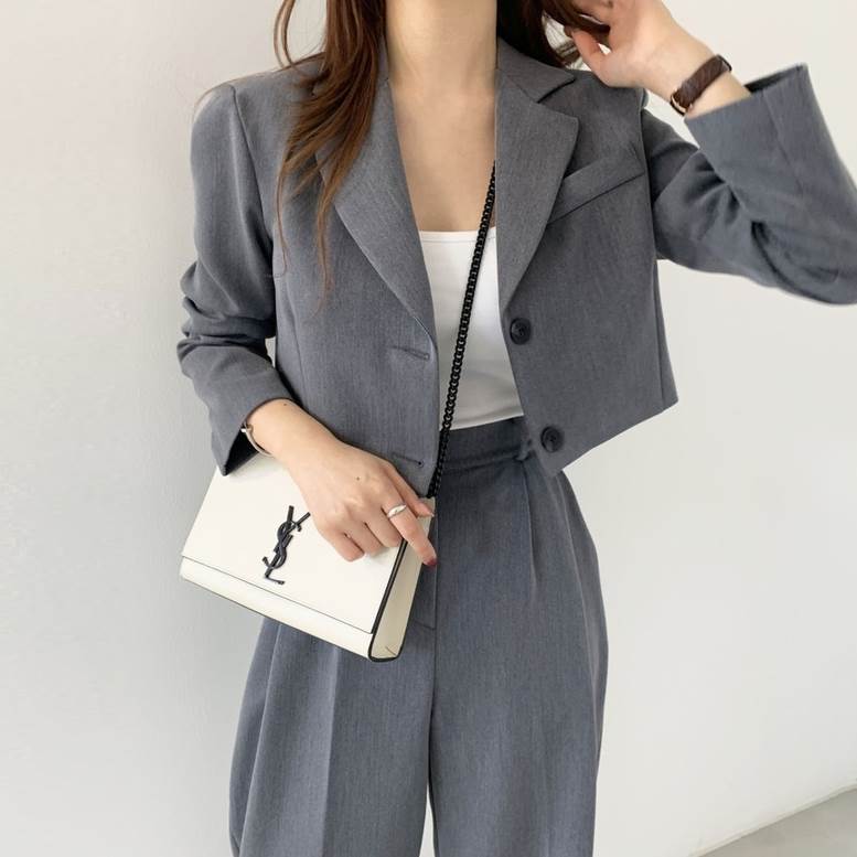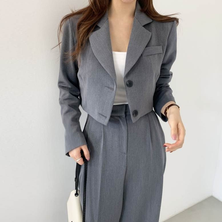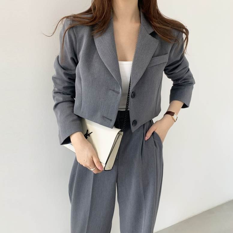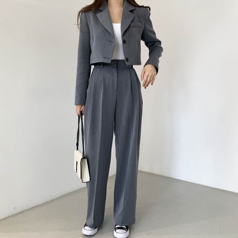クロップドジャケット&センタープレスパンツスーツ セットアップ レディース 春 秋 上下 ツーピース スーツ 個性的 パンツスーツ クロップド丈 ロングパンツ