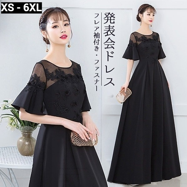 レディース ロングドレス フォーマル 母親用 ブラック 透け感 ラウンドネック シースルー襟 フレア半袖 結婚式 パーティー ピアノ発表会 お呼ばれ 大人 ファスナー仕様 ロング丈 演奏会用 ドレス