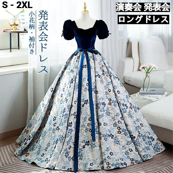 ロングドレス ステージ衣装 大人用 小花柄 ペンタゴンネック パフスリーブ プリンセスライン 背中開きデザイン 演奏会/ピアノ発表会 パーティー/披露宴 ウェディングドレス 半袖袖付き 編み上げディテール 花嫁サポート カラードレス コンサート 舞台用 結婚式 フォーマル