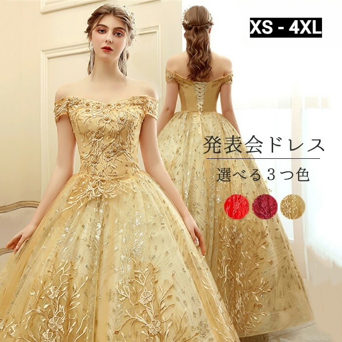 ロングドレス カラードレス 大人用 大きいサイズ オフショルダー 編み上げ刺繍 ウェディングドレス/結婚式 ステージ衣装 ピアノ発表会 成人式/二次会用 コンサート イブニングドレス 舞台衣装 演奏会用 袖ありデザイン ゴールドアクセント 花嫁ドレス