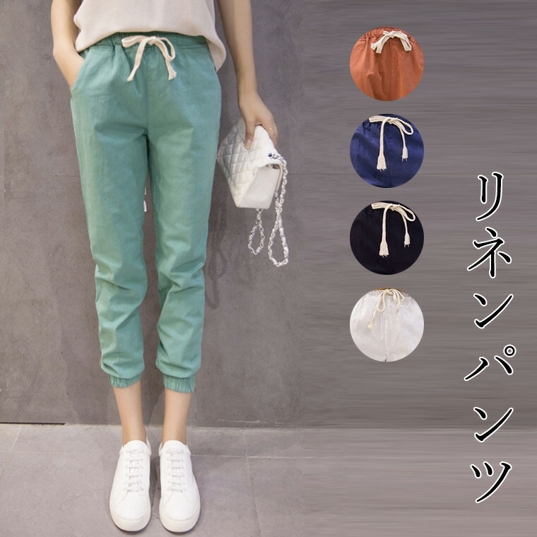 -3サイズ 高見え上品なリネンパンツ 七分丈 ウエストゴム 足首リブ ゴム レディース カラーパンツ ロングパンツ ストレート デニム ジーンズ レトロ ハイウエスト ボトムス