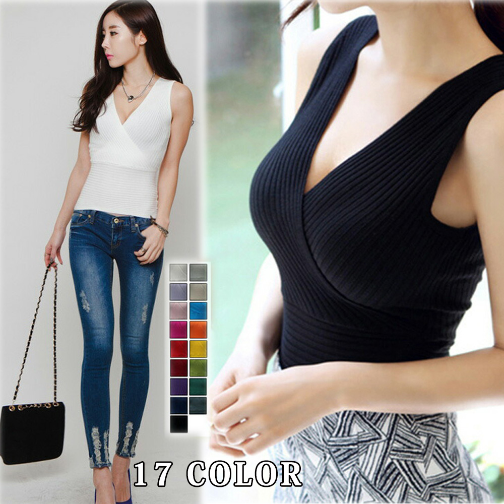 ノースリーブ ニット トップス ショート丈 全17色 かっこいい ニット リブニット カシュクール Vネック F フリーサイズ レディース ブラック ホワイト