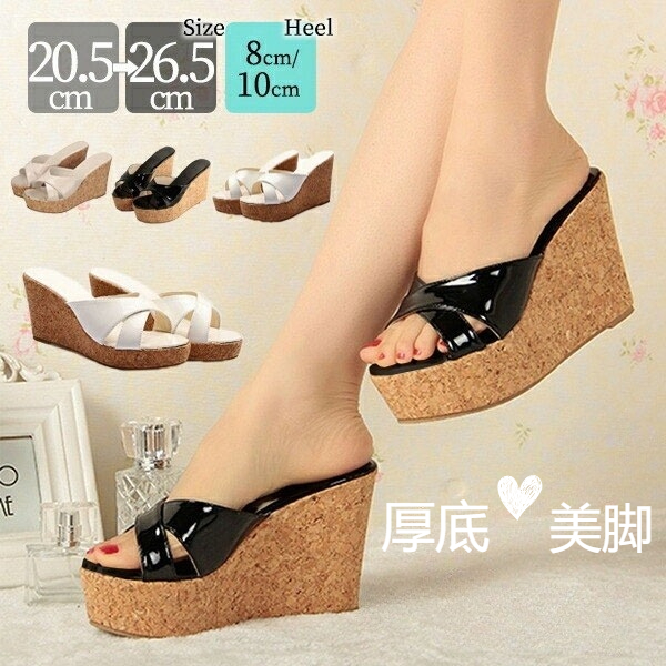 レディース 厚底ウェッジソールサンダル ミュールタイプ オープントゥ ヒール8cm/10cm 履きやすい つっかけデザイン かかとなし 美脚効果 サイズ対応(小さい~大きい) ビーチサンダル