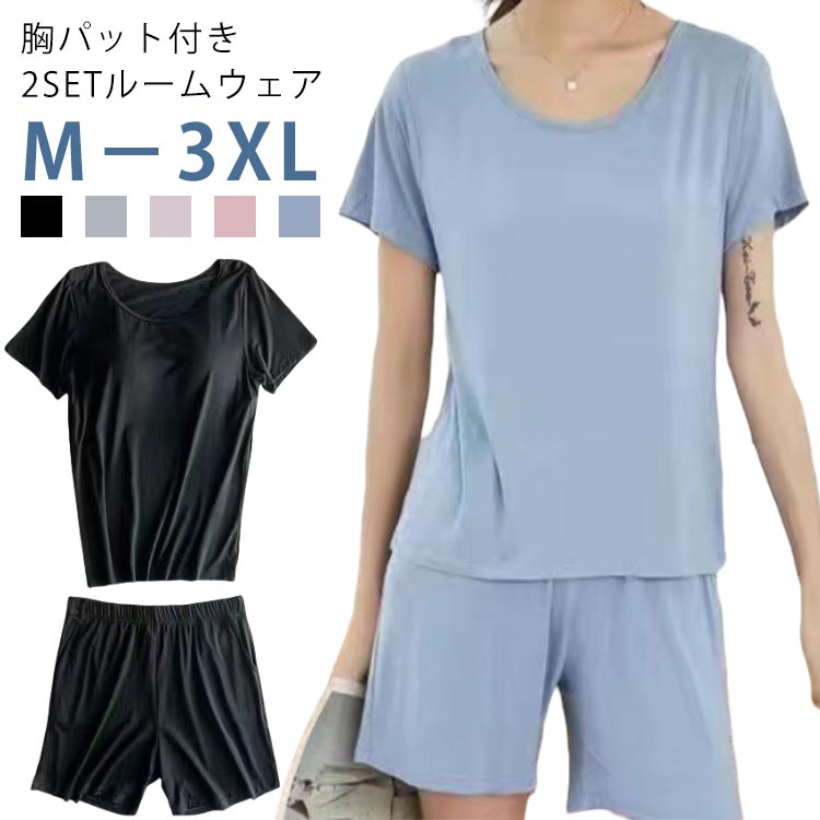 上下セット 部屋着 レディース ブラ付き 大 半袖Tシャツ 2点セット 夏 ショートパンツ 前のみ 締め付けない カップ付きTシャツ モダール 半袖 パジャマ 無地 ゆったり ナイトブラ ナイト 丸首