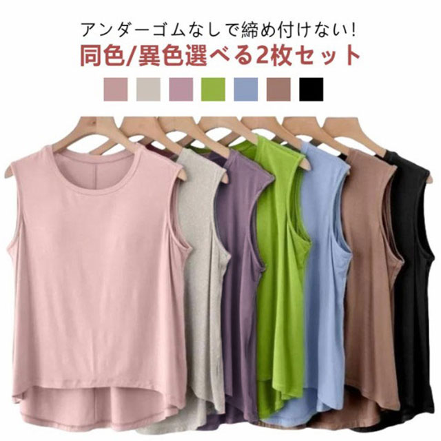 ゆったり インナー レディース 2枚セット アンダーゴムなし ルームウェア カップ付 ゴムなし ブラトップ ゴム無し 夏 背中 部屋着 カップ付き Tシャツ 袖無し ブラ付き 締め 袖なし