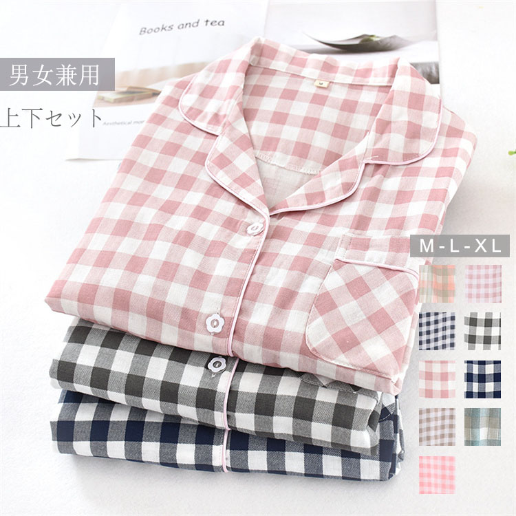 パジャマ 綿 部屋着 長袖 長ズボン 前開き レディース メンズ チェック シンプル 上下セット2点セット テーラー襟 ギンガムルームウェア