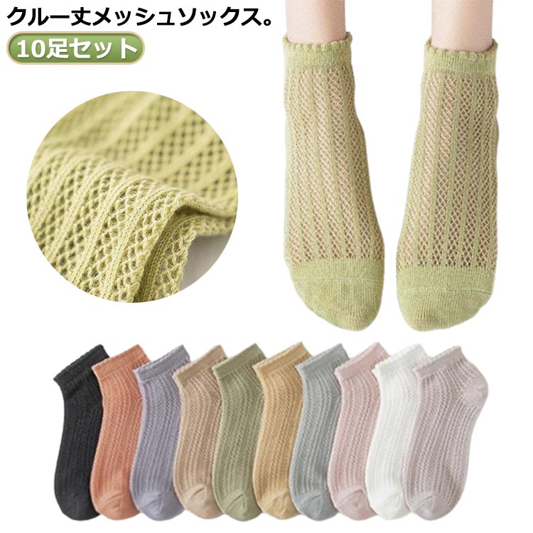 クルー丈 接触冷感 ソックス 10足セット 靴下 レディース 夏用 薄手 高校生 黒 学生 メッシュ 女子 白