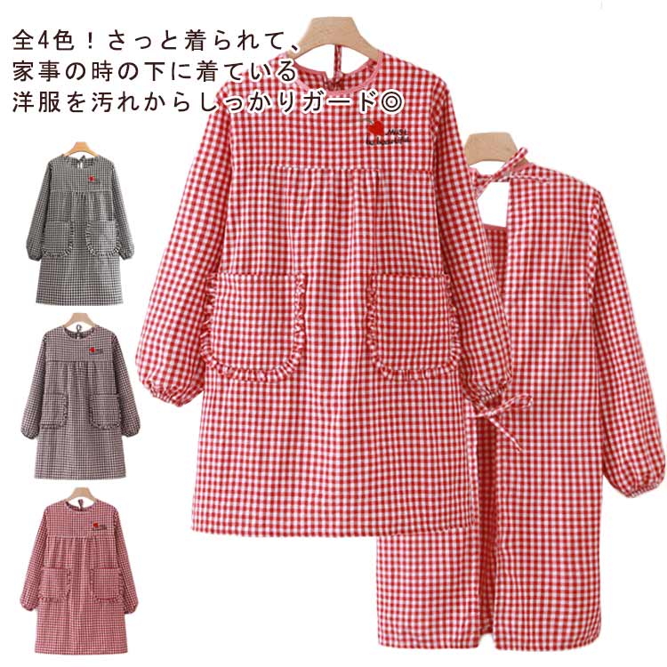 袖付き エプロン レディース 北欧 かっぽう着 かわいい ロング丈 チェック柄 家事 キッチン 割烹着 料理教室 保育士 ガーデニング ゆったり 大きめ シンプル カフェ