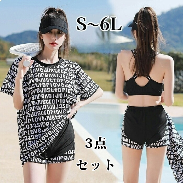 水着 レディース 大きいサイズ 3点セット タンキニ ラッシュガード 体型カバー ぽっちゃり ノンワイヤー パッド付 露出控えめ スポーティー 水陸両用 UVカット 3L 4L 5L 6L 10代 20代 30代 ママ 中学生 高校生 おしゃれ 可愛い 韓国 黒