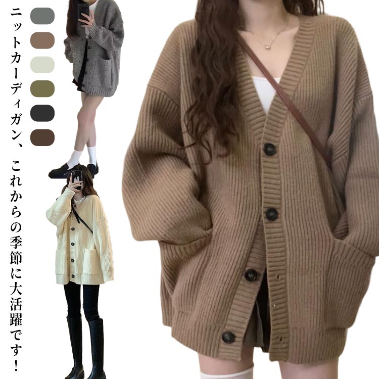 ニットカーディガン ルーズ 大きいサイズ ポケット ゆったり セーター 可愛い 制服 無地 リブ袖